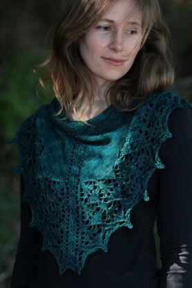 Treeangle is a top-down triangle inspired by many magical hours walking in tall forests. It has a lightly cabled lace, with optional subtle beading, and an unusually constructed trunk for a spine. The cables remind me of the branches and vines of forest growth, and the leaves have the spiky look of holly or pin oak from some angles, or the round curves of birch or pear leaves.