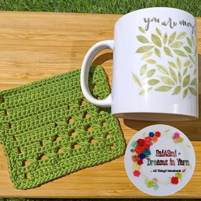 COMPLETED SIZE: approximately a 4 * 4.5” inches rectangle coaster. If yarn used is thicker, the size may vary Materials: ● Light DK/ Sport weight – Cotton/Cotton mix; ● I HAVE USED: Cracker Cotton yarn from Yarnkart. Total Yardage: 85 m/93 yards for 50g. About 15 yards. ● Crochet hook – I HAVE USED: US Size D (3 mm hook) for the project featured in the picture.