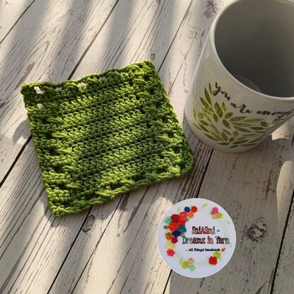 COMPLETED SIZE: approximately a 4.5” inches square coaster. If yarn used is thicker, the size may vary Materials: ● Light DK/ Sport weight – Cotton/Cotton mix; ● I HAVE USED: Cracker Cotton yarn from Yarnkart. Total Yardage: 85 m/93 yards for 50g. About 12 yards. ● Crochet hook – I HAVE USED: US Size D (3 mm hook) for the project featured in the picture.