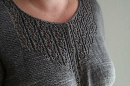 This cardigan is worked seamlessly from the bottom up in one piece. Stitches are picked up for the armholes and shoulders are shaped with short rows. Fake seams give structure to the garment. An i-cord edging allows a neat finish and highlights the elegant lace bib which follows feminine curves.