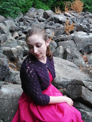 This pattern was inspired by a favorite vintage lace bolero I found in a thrift shop. Its cropped length and 3/4 sleeves make it a perfect layering piece. The bolero works as well with jeans and a t-shirt as it does with a party dress. The pattern is knit in one piece in a classic trellis lace pattern and seamed at the sides before edges are finished with a simple k1 p1 rib.