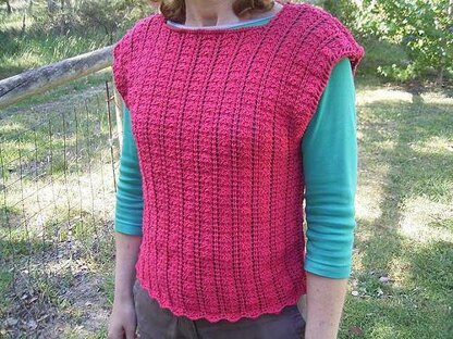 A lace rib vest in cotton. The only shaping is to cast off for a square neckline. The stitch pattern comes from volume three of a 1980’s English knitting series called Creative Knitting. No details of the publisher are available in this edition. It pays to count stitches frequently, as it is easy to add or lose a “yo”, or forget a “pass slip stitch over”. Or maybe that’s just me.