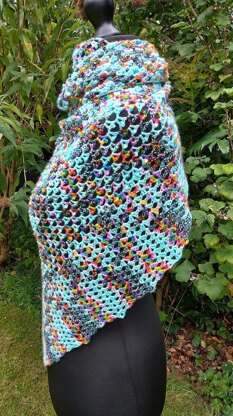 A light, summer shawl for any sock/fingering weight yarn. I’ve used 2 skeins/730m of a beautiful sock yarn and a simple repeating pattern to create this elegant, asymmetric shawl. The shawl starts at the narrow, bottom point, and one side is increased on every row to create a gentle curve. Once the depth of the shawl is achieved, the pattern changes to create a straight-edged border. Pattern is written in English and uses UK terms.