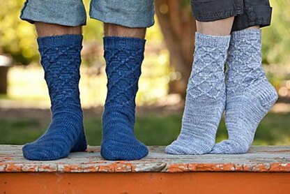Worked from the cuff down in a fine Fingering weight yarn, Trellis feature cables settled on the Stocking stitch background. Both size socks are worked following the same pattern instructions; changing needle size and using either Fingering or a DK weight yarn makes them different size.