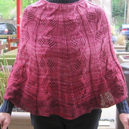 This is a pattern for a knit poncho that incorporates both a cable lace stitch and a little known lace-mesh stitch. It is knit from the bottom up on two circular needles.