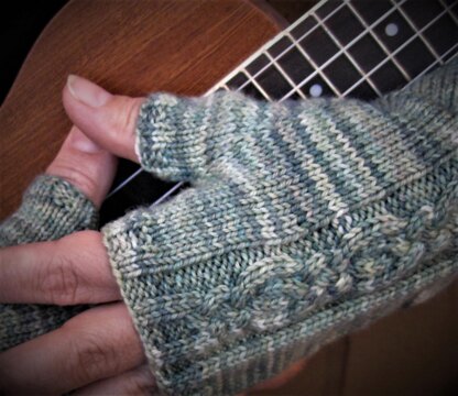 These mid-length fingerless mitts feature a braid and cable panel over the top of the hand with comfortable stockinette stitch for the palm and thumb. The left and right mitts are similar but not identical. The mitts are worked in the round using fingering weight yarn.