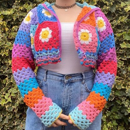 The pieces are joined as you go, so there’s no seaming afterwards. The sleeves are worked in the round downwards from the shoulder to the cuff. The hood is worked upwards in one piece and there’s a short seam to close the top of the hood. This seam is worked in ss and can’t be seen, even when the hood is down. This pattern is great for using up yarn scraps.