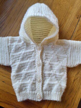 Baby hoodie, age 0-3 months, 14-16" chest. Knitted in a textured triangles design, suitable for boy or girl.