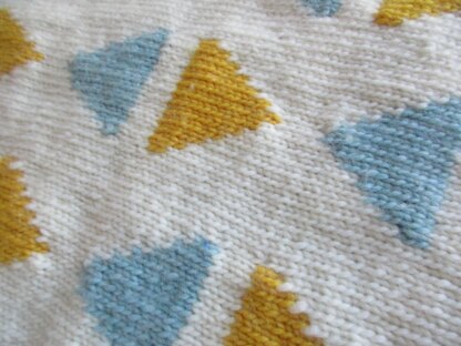 This is a pattern for Triangles Cot Blanket. It is knitted in a soft bulky yarn with a simple intarsia pattern, and garter stitch edges.