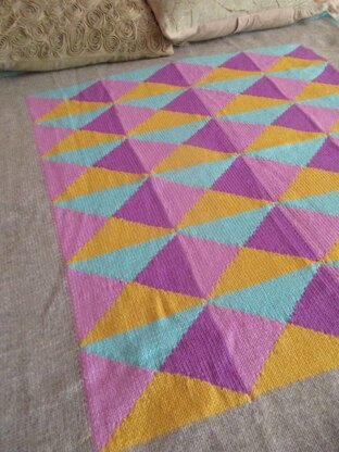 This is a pattern for Triangles Throw, originally published in Simply Knitting. It is knitted in strips in intarsia, with wide edges, then sewn together and the edges knitted when complete, and a garter stitch edging made by oicking up stitches. Main photo Simply Knitting.