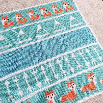 A beautiful baby blanket with 5 panels, each with a different fox or tribal design including both written pattern and charts.