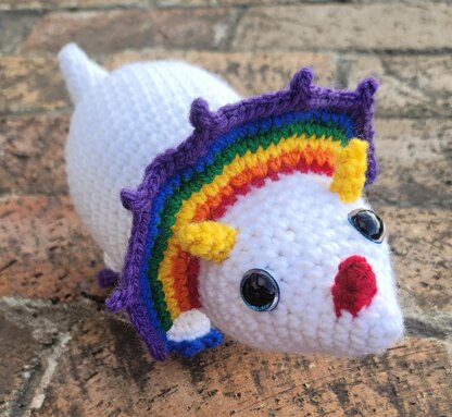 Materials needed: Worsted weight yarn 110 yards white 10 yards each red, orange, yellow, green, blue, purple Size G (4.00 mm) crochet hook Yarn needle Plastic safety eyes 15 mm Fiberfil