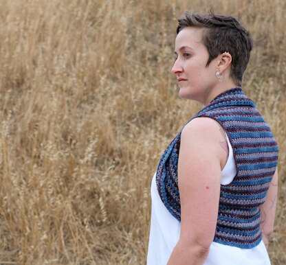 Fast and fun to crochet, this striped shrug is perfect to pop over dresses for a little extra color and warmth. It’s worked in one piece, with the edging folding over to create a plush collar. This is a fun project for scrap yarn and mini skeins and you can even mix in some slightly thicker or thinner yarns. Sizing is flexible with options to adjust the armhole circumference and the length of the edging. For a slightly racerback look as shown, choose a size with a back width measurement that’s just outside your bra straps, or choose a wider back for more coverage. This pattern is part of the Sun and Fog Collection, a collaboration by indie dyers and designers in the San Francisco Bay Area.