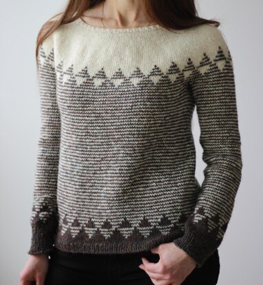 Triggy is a modern take on a colorwork yoke. Fresh and punchy, it features an uber simple stranded motif and one round stripes to please the eye while transitioning to a second color and reverting the same motif at the hem. Pick your two favorite high contrast colors and cast on! The pattern is available in 10 sizes.