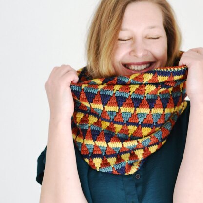 The Trillian cowl features a bold geometric pattern on the right side and textured, colorful, thin stripes on the wrong side. The pattern is very versatile and allows for multiple color variations.