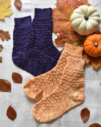 This stylish pair of socks knitted in combination of textured stitch, stockinette and 1 x 1 rib. Socks can be knitted either on DPN or using magic loop method. The magic loop is more preferable because of the stitches which crosses straight in the middle of front part. The foot length is easily adjustable.