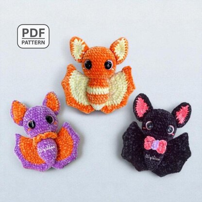 This pattern creates three different bat plush toys using chenille yarn and continuous spiral rounds. Each bat includes separate pieces such as head, body, ears, wings and optional accessories like bows, which are assembled together.