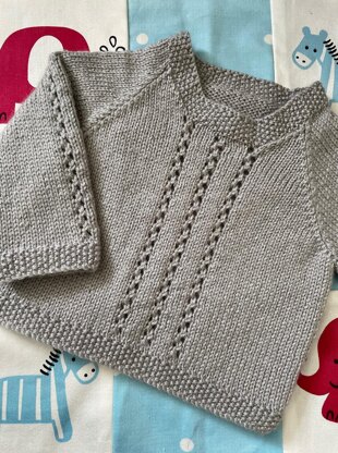 Designed especially for little ones, this cosy 4-ply sweater features zig zag eyelets on the front and sleeves. Each part of the sweater is worked flat from the bottom up and seamed, with stitches picked up from holders and the neck shaping to create the neckband.