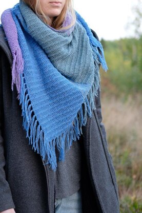 Trio is a beautifully textured shawl with fringe. It’s worked from one tip to the bind off edge in three colors. Solid sections are worked in Garter Rib and the color shifts are worked in striped Stockinette. The pattern includes a photo tutorial for the fringe.