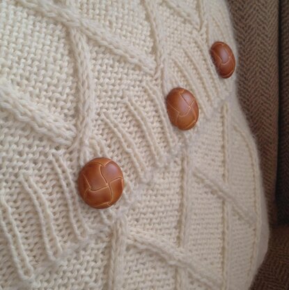 The simple aran cable cushion cover is knit using a worsted/aran yarn and has three buttons to secure the envelope closure. Easy to remove if you wish to wash the cover or change your decor. Choose some great buttons to add your own design element.