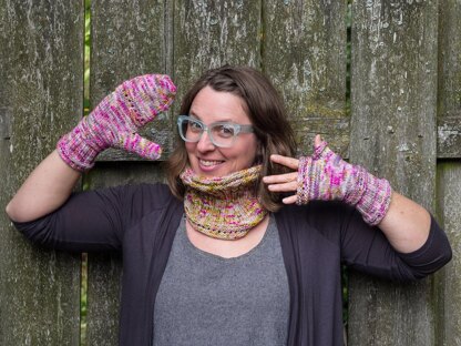 Whip up a pair of fingerless mitts, some full-on mittens, or a cowl. Each pattern takes less than 150 yards of worsted-weight yarn, so any of the three is a quick project. Together, they’re a perfect set.