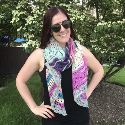 Their DK sparkle is a fantastic base to really spruce up this Tropical Christmas Stole that is knit on the bias! You will need approx. 680yds of DK weight yarn and size 5.5mm (US8). The stitch count never exceeds 70 sts so you don’t need a very long cord if you’re using circulars.