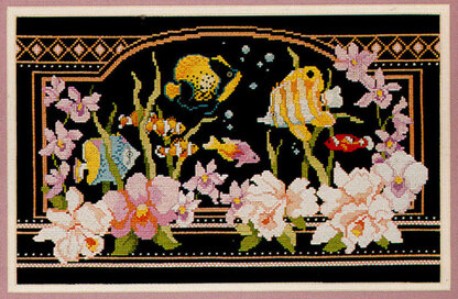 Designed by: Nancy Rossi. Dramatically stitched on black fabric, this tropical underwater scene will put you in paradise. With bright tropical angel fish and gorgeous orchids in the foreground, this elegant design is mesmerizing to look at and delightful to stitch.\n