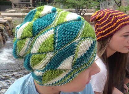 The TryAngles Hat uses short-rows triangles, are working one way, and then filling in with triangles worked the opposite way with plain rounds worked in between. The crown can either be worked in the round or in short-row triangles, finishing with either grafting or a short three-needle bind off.
