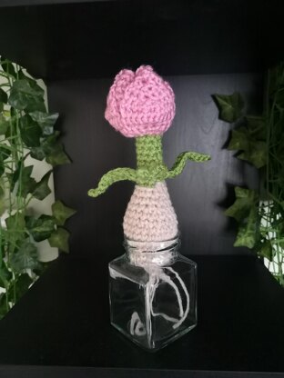 The crochet pattern is written using US crochet terms and includes instructions on how to make a tulip spring bulb.