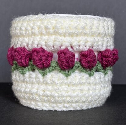 The 10 page pattern is presented in a step by step guide with illustrative photographs. The design is a vintage crochet style with its line of Tulips and includes handles to attach over your mug’s handle. The main yarn used in the design for the cosy is a Hayfield Chunky yarn in Cream 25g. It creates a thick thermal cosy, it can be made with a DK yarn but the finish will not be as firm. The Tulip pattern I used 5g in Hayfield Bonus DK in Cerise and the leaves in Grass used less than 5g. Will fit a mug 25cm x 8 cm (250-300ml) and incudes added instructions to custom fit to a larger/ smaller mug.
