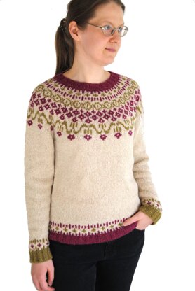Tulip Route is a relaxed colorwork yoke sweater worked seamlessly from the top down. Pick DK-weight yarn in two or three contrasting colors for a bike ride amidst the blooming tulip fields.