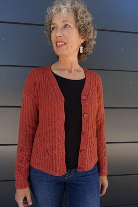 This is a classic cardigan worked in a fun 2/2 broken rib texture and a very engaging Tulipani stitch pattern. It is worked from the bottom up, with back and fronts started at the same time. After working the bottom edge in 2/2 Broken Rib, two sections of Tulipani stitch are started and their precise and symmetrical placement makes them end right under the armholes. After working the V neck shaping and some short rows for the shoulder slopes, the shoulder seams are finished using a three needle bind-off. The sleeves are worked flat from the cuffs and at the end the button band is picked up and worked in garter rib.