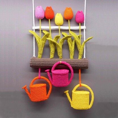 Tulips & watering cans hanging decoration - simple from scraps of yarn