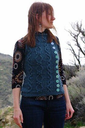 Tumbleweed is an asymmetrical sweater-vest inspired by the classic cabled Aran, but features less conventional cables and a rogue flair. It is worked seamlessly from the bottom-up and includes waist shaping for a more flattering fit. Pattern is sized from 28” / 71 cm bust to 58” / 147 bust, with sizing increments as appropriate.