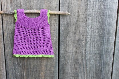 A pretty baby tunic with vintage appeal combining a modified Victorian lace stitch pattern with the simple shaping of a 1930s era singlet. The tunic is knit from the bottom up in the round with a crochet shell stitch along the hem and the caps of the sleeves. The ribbing around the chest provides a snug fit while also having enough stretch to allow for ease of movement. Suitable as a summer sleeveless top or an extra layer in fall and winter.