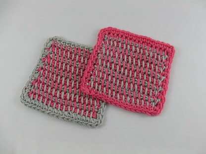 These cute, machine-washable "mug rugs" work up quickly in Tunisian simple stitch using two colors of Fantasy Naturale 100% cotton. You will be able to make 8 coasters from the 2 skeins in contrasting colors. Pattern includes technique photos.