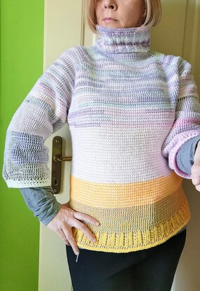 A must-have item in every woman’s wardrobe, this turtleneck sweater in Tunisian Simple stitch and Rib stitch is surprisingly easy and quick to do. Just as cosy and comfortable it is to wear it yourself!MATERIALS Size S 13.4 oz (380 g); Size M 14.3 oz (405 g); Size L 15 oz (430 g) of Fine (2) to Light (3) yarn in the colours of your choice, 15 WPI Straight Tunisian hook (long); double-pointed Tunisian hook: 4 mm (8, G6); stitch markers • STITCHES USED Tunisian Simple Stitch (worked in the round); Tunisian Rib Stitch (2+2, worked flat and in the round); regular crochet basics • GAUGE 19 sts x 13 rows = 4” (10 cm) • DIMENSIONS Length (neck excluded, same for all sizes: about 24.4” (62 cm) Neck (same for all sizes): 3.7” (9,5 cm) high Sleeves (same for all sizes): 21.6” (55 cm) from neck Bust Widths - S: 17.7” (45 cm); M: 19.7” (50 cm); L: 20.8” (55 cm)