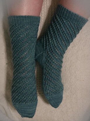 This design was inspired by the tightly coiled cone shaped shells of the Turritella genus of sea snails. The spiral lace pattern on these socks, which looks much more complicated than it is, has a very tight bias which twists down the leg.