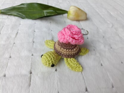 This adorable crochet turtle keychain features a unique floral shell. The turtle's body, including its head, legs, and tail, is crocheted in a soft green color, while the shell features a brown base with a vibrant pink crochet rose on top. The turtle has small black safety eyes, adding to its cute expression. The attached metal keychain makes it a perfect handmade accessory for bags, keys, or gifts. The combination of an animal and floral element creates a charming and creative crochet design.