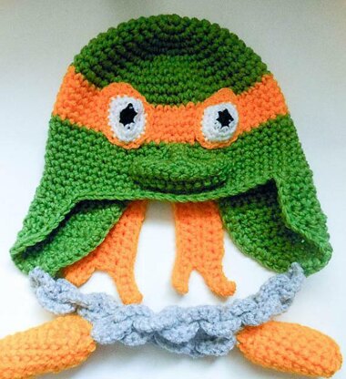 Adorably cute Turtles Earflap Hat pattern with the unique addition of Nunchucks for ties. - Orange, - Red, - Blue, - Purple whichever is yours or your little ones favourite.