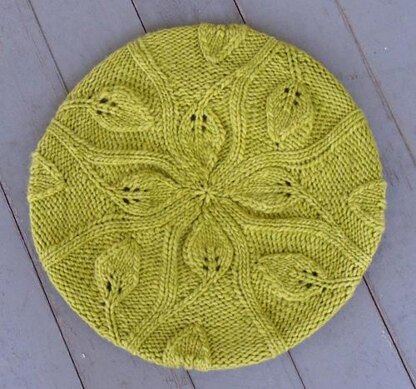 Worked in the round from the bottom up this hat uses knits, purls, and simple lace to create a field of leaves and vines that decrease into the center top.