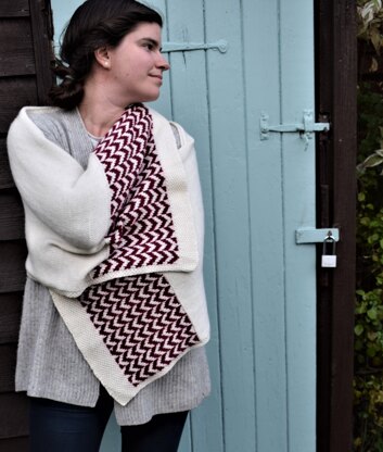 This modern rectangular shawl has a beautiful tweed fair isle detail along each end and moss (seed) stitch border around the entire shawl.