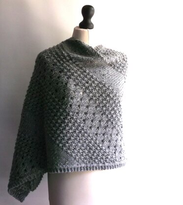 This wrap knits up quickly in a chunky yarn. Worked on the bias, we start at one corner with an increase section, then work straight to a decrease section before casting off. Stocking stitch, eyelets, and a textured pebble stitch are surrounded by a garter stitch border.