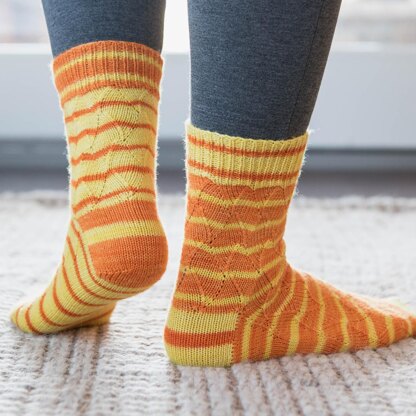 Much like the iconic twins themselves, Tweedle Toes creates an odd pair of socks, perfectly matched to be mis-matched. These top-down socks use simple increases and decreases to create unpredictable ripples in your favorite self-striping yarn. To get the full effect, use Fibernymph Dye Works Inversibles—half skeins of two-colored stripes dyed as opposites. Ready for a bit of an adventure? It’s time to cast-on Tweedle Toes!