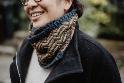 Inspired by traditional herringbone tweed fabric, two color tapestry colorwork mimics a herringbone pattern in this cosy cowl which can also be made as a longer infinity scarf. Tweel is the Scots word for twill and thanks to an error made by a London cloth merchant, we have tweed fabrics and not tweel fabrics!