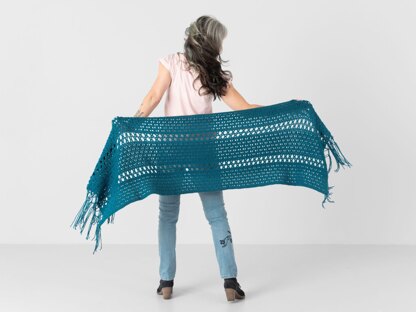 This women’s shawl is made with worsted weight yarn which makes it a fairly quick project and the macrame edging gives it a fun twist. Light and airy, it is great for any time of year.