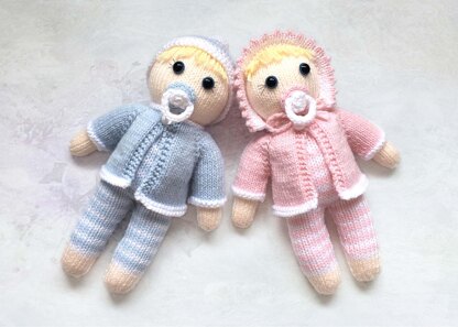 The babies' legs, body and head are knit in one piece which makes this a very quick project to make. The patterns are knit flat and seamed and are very easy to follow with clear instructions and photos.