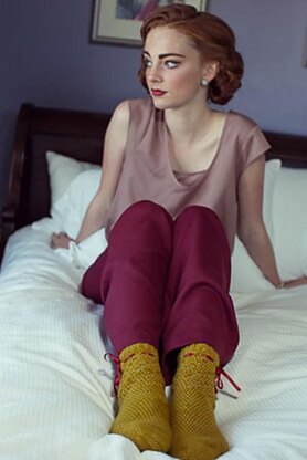 These socks are worked top down, in the round, with ribbing on the cuff, followed by an eyelet pattern on the leg. The heel flap in worked separately and then then crocheted around, before decreasing for the gusset. These socks are simple yet fun, finished with a ribbon round the top. Perfect for spring time!