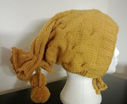 Ribbed brim and neck line, casual cable pattern on the body, drawstrings at the crown.