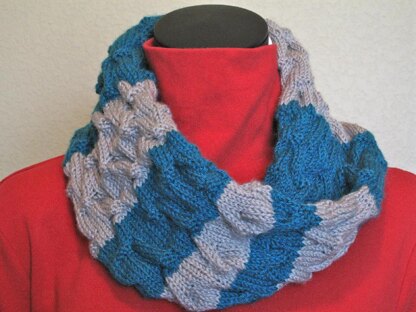 Worked on US #7 (4.5mm) needles and using approx 220 yards each of 2 colors, it creates a double layered, soft and warm cowl. The pattern is written and charted.